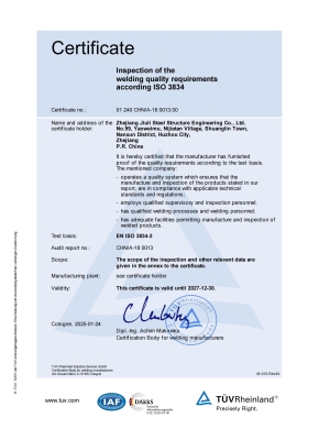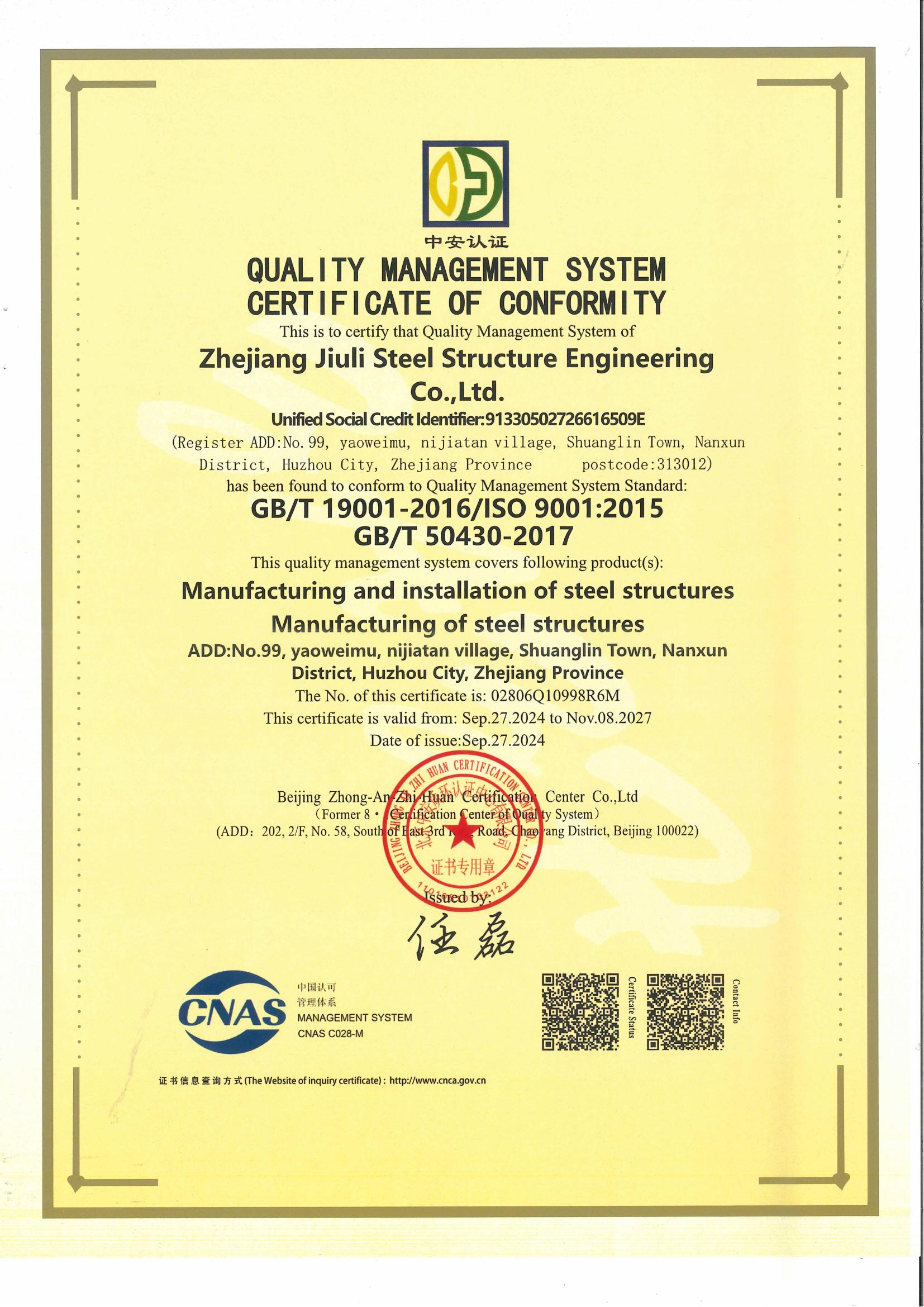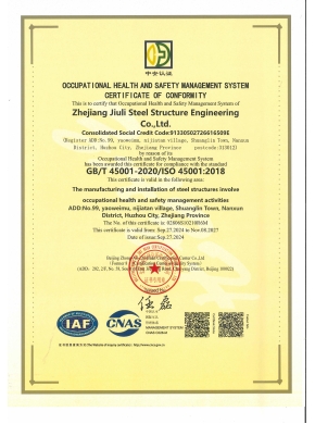 The company has a comprehensive quality assurance system and has passed the certification of ISO9001:2015 quality assurance system. Having the second level general contracting qualification for construction projects, the first level professional contracting qualification for steel structures, and the special manufacturing qualification issued by the Ministry of Construction. We specialize in undertaking the construction of various industrial and civil engineering projects, as well as the design, manufacturing, and installation of steel structures. The company is based in the domestic market and has established multiple marketing offices nationwide, gradually forming a nationwide marketing network and actively participating in international competition. The company has the Canadian CWB certificate, American AISC certificate, European EN1090 and ISO3834 certificate certified by the Canadian Welding Association, and can undertake the export processing of steel components with special requirements from Europe, America, Australia, and other countries. It has successfully established branches in Madagascar and Botswana in Africa. Jiuli Steel Structure is one of the first construction enterprises in the Huzhou region to enter the international market.