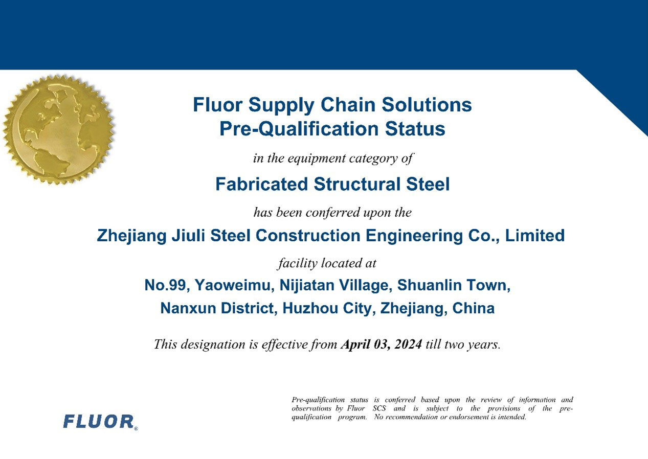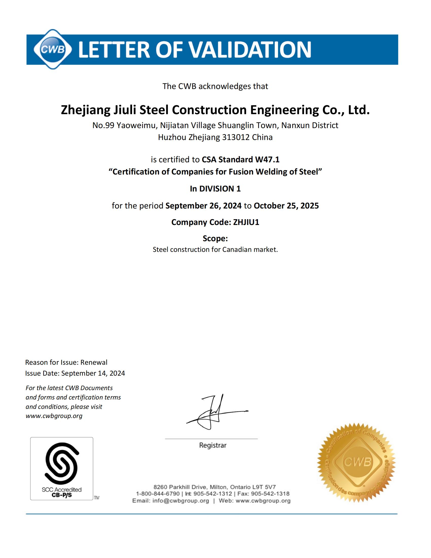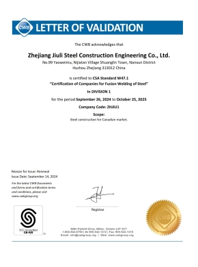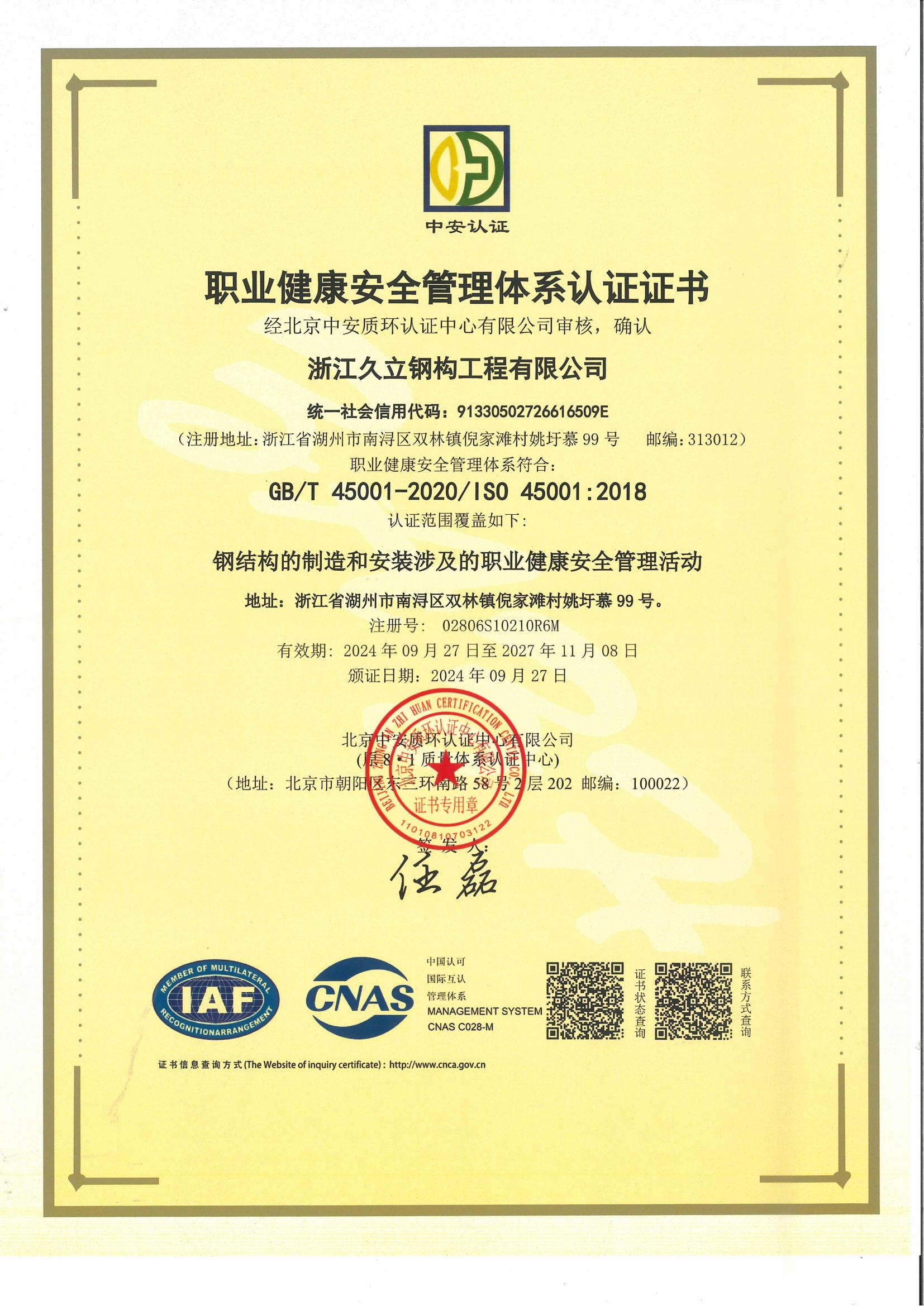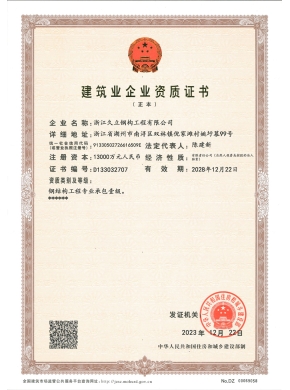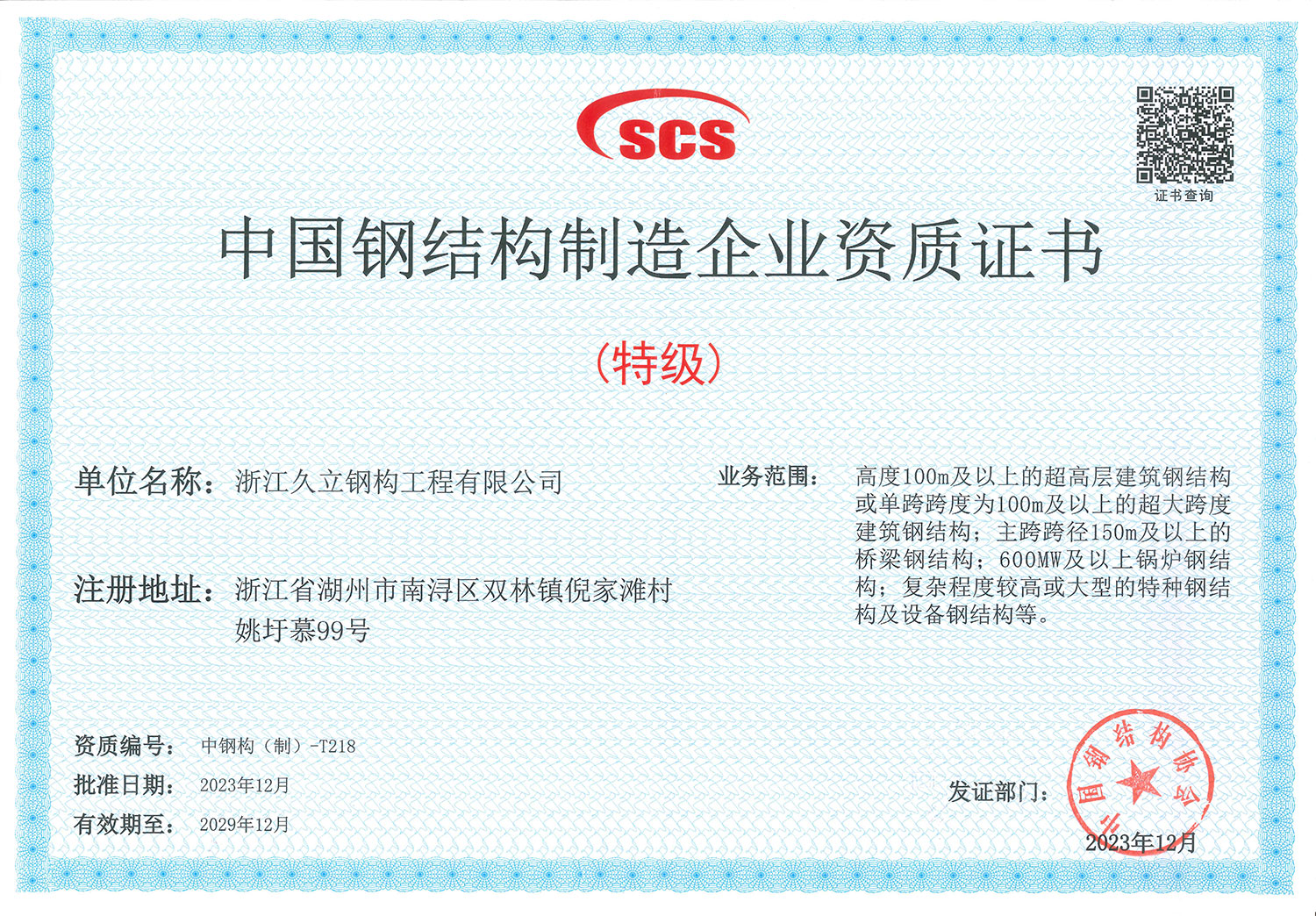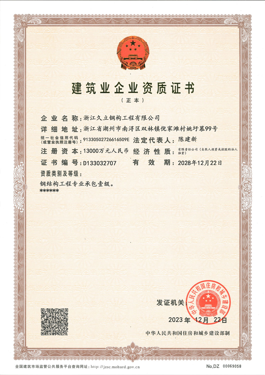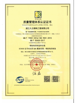 公司建有完善的質保體系,通過了IS09001:2015 質保體系的認證。擁有建設部頒發(fā)的建筑工程施工總承包貳級、鋼結構專業(yè)承包壹級資質、制造特級資質。專業(yè)承接各類工業(yè)與民用工程的建設,鋼結構的設計、制造和安裝。公司立足國內市場,目前已在全國建立多個營銷辦事處,逐步形成了輻射全國的營銷網(wǎng)絡,并積極參與國際競爭,公司擁有加拿大焊接協(xié)會資格論證的加拿大 CWB 證書,美標 AISC 證書,歐標EN1090和IS03834 證書,可承接來自歐美、澳洲等有特殊要求鋼構件的出口加工,已成功地在非洲馬達加斯加國及博茨瓦納設立了分公司久立鋼構是湖州地區(qū)率先進入國際市場的建筑企業(yè)之一。