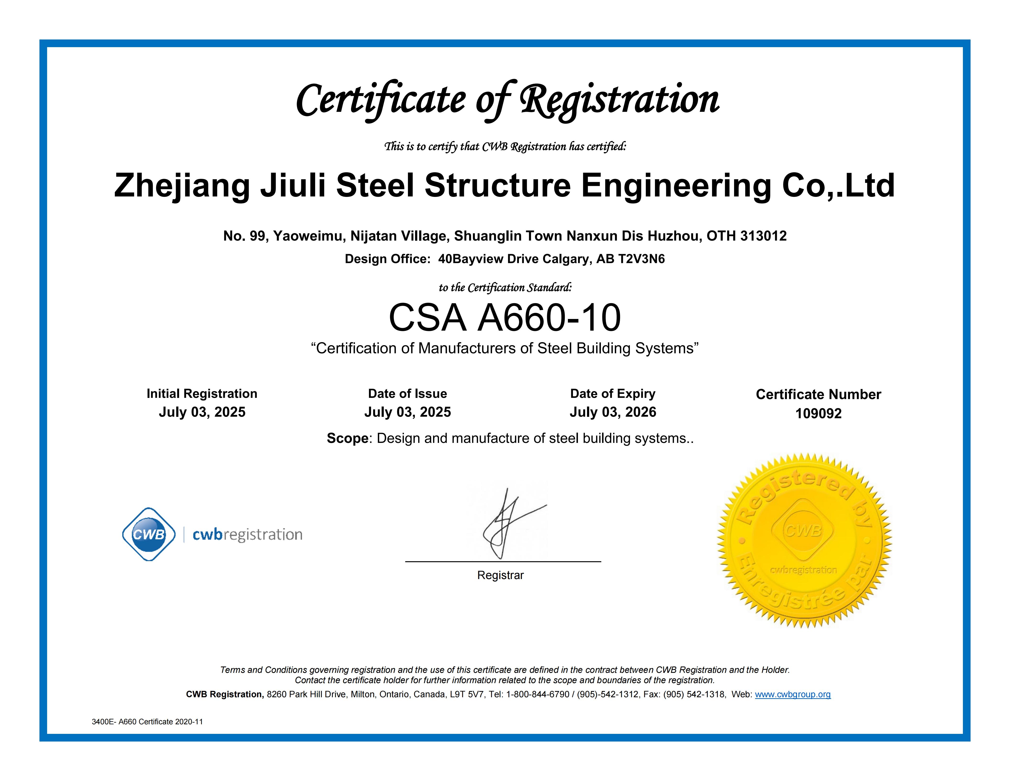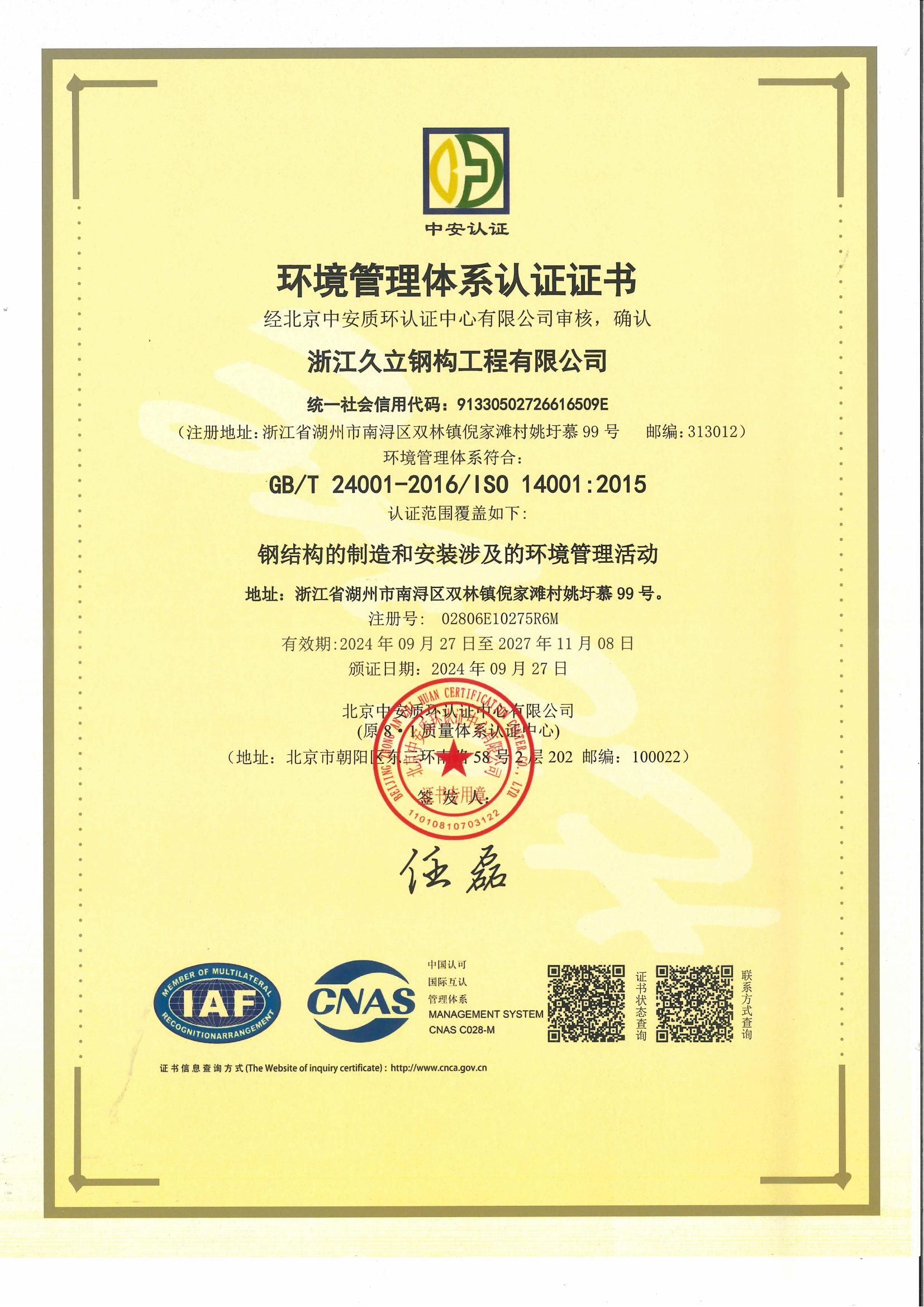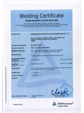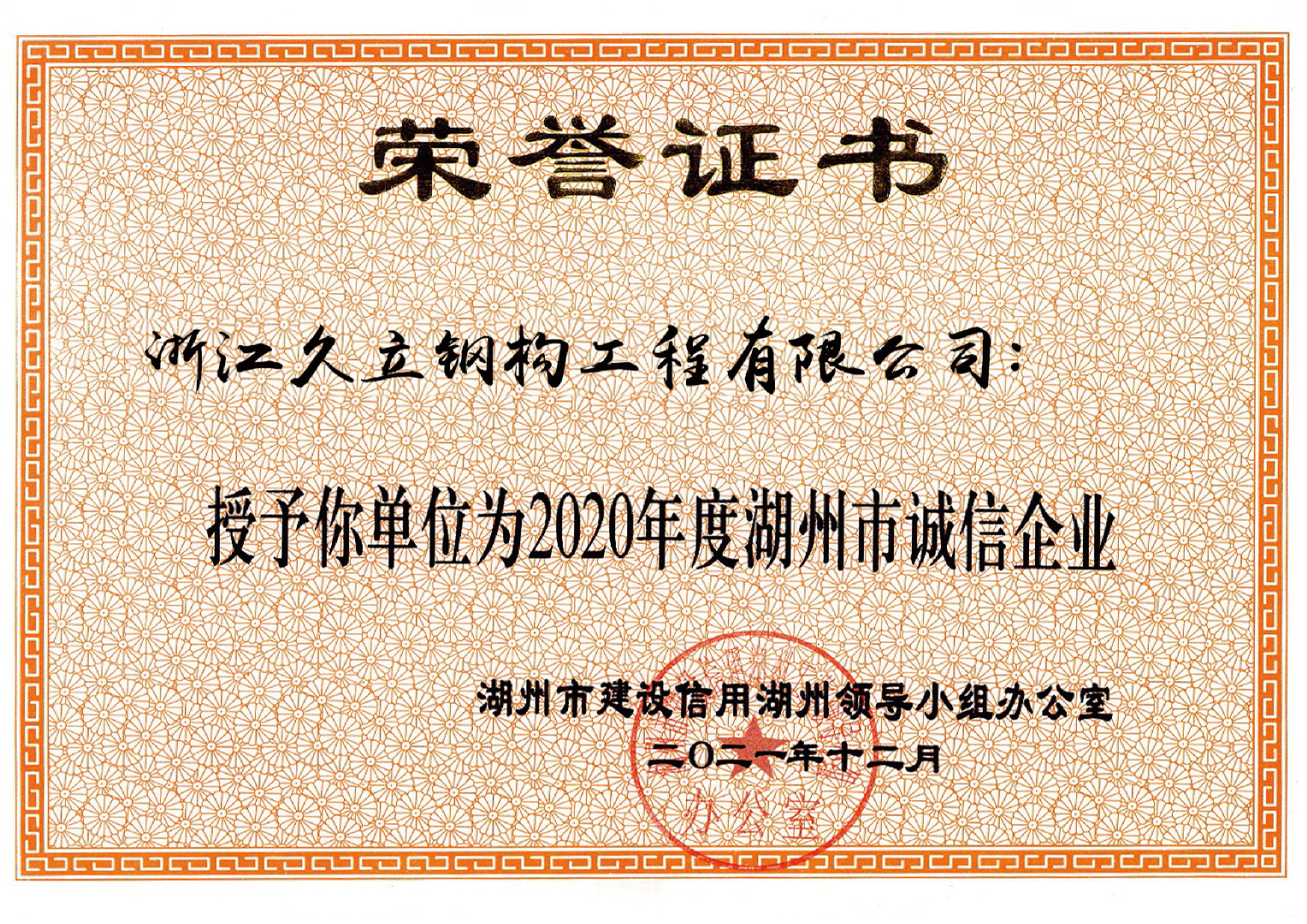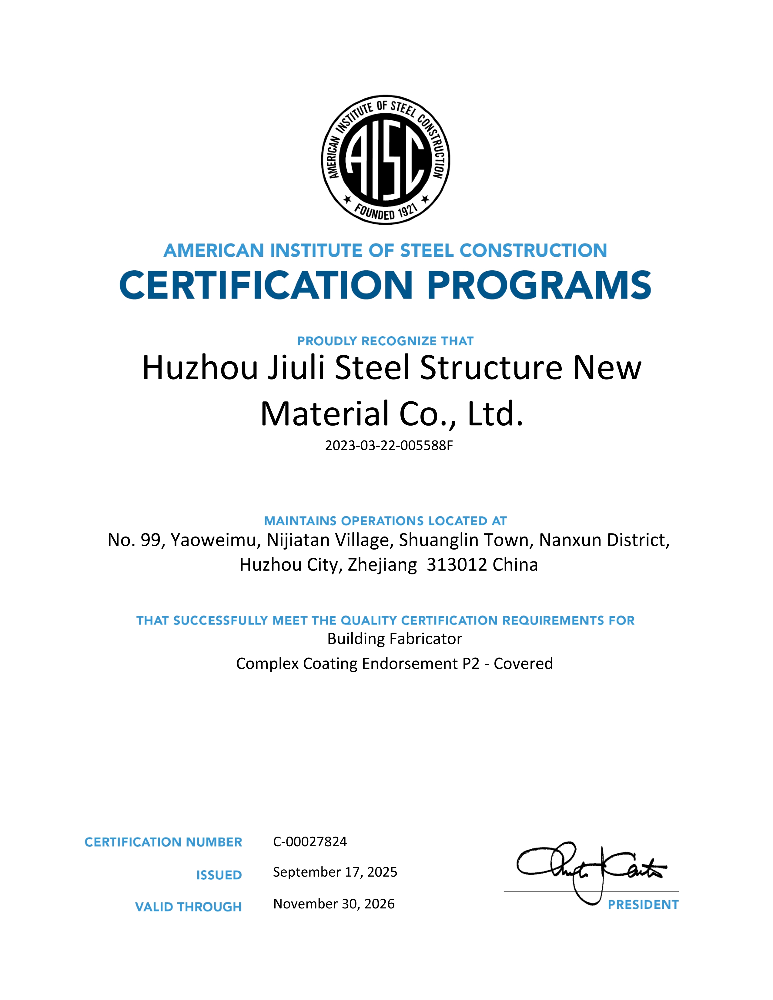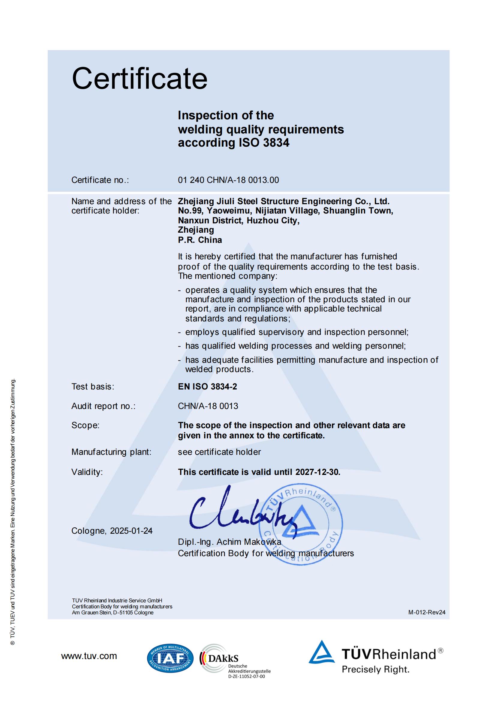 公司建有完善的質保體系,通過了IS09001:2015 質保體系的認證。擁有建設部頒發(fā)的建筑工程施工總承包貳級、鋼結構專業(yè)承包壹級資質、制造特級資質。專業(yè)承接各類工業(yè)與民用工程的建設,鋼結構的設計、制造和安裝。公司立足國內市場,目前已在全國建立多個營銷辦事處,逐步形成了輻射全國的營銷網(wǎng)絡,并積極參與國際競爭,公司擁有加拿大焊接協(xié)會資格論證的加拿大 CWB 證書,美標 AISC 證書,歐標EN1090和IS03834 證書,可承接來自歐美、澳洲等有特殊要求鋼構件的出口加工,已成功地在非洲馬達加斯加國及博茨瓦納設立了分公司久立鋼構是湖州地區(qū)率先進入國際市場的建筑企業(yè)之一。